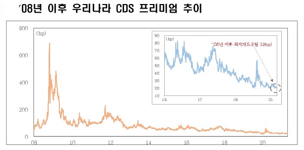 6일 기획재정부에 따르면 우리나라 국채에 대한 CDS(신용부도스왑) 프리미엄이 5일(뉴욕 현지시간) 13년 만에 가장 낮은 19bp(1bp=0.01%p)를 기록하면서 2008년 글로벌 금융위기 이후 최저치를 경신했다고 밝혔다. 이는 전 세계 국가 중 17위로, 신흥국 가운데 가장 낮으며 주요 선진국과 비교하면 프랑스보다 낮고, 캐나다와 유사한 수준이다.