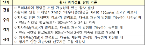 황사 위기경보 '관심' 단계가 발령됨에 따라 환경부는 황사 대응 매뉴얼에 따라 황사상황반을 구성하고, 유관기관과 해당 지자체에는 매뉴얼에 따라 대응할 것을 요청하였다.