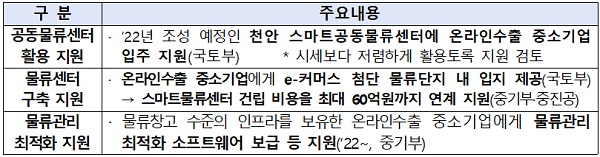 온라인수출 중소기업의 공동물류센터 활용, 자체 물류센터 건립, 물류관리 최적화 등 물류고도화를 패키지로 지원하고 4000억 원 규모의 수출지원펀드 운용사 등을 대상으로 기업설명(IR)을 개최하고, 온라인몰 스마트화를 지원한다.