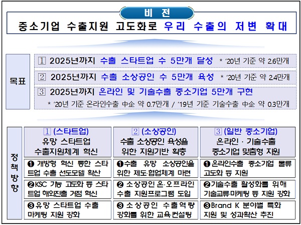중기부는 이번 대책을 통해 2025년까지 수출 스타트업 5만 개, 수출 소상공인 5만 개, 온라인 수출과 기술수출 중소기업 5만 개를 이루겠다는 정책목표를 제시했으며, 정책목표 달성 시 수출 중소기업 수가 최대 2배까지 확대될 것으로 기대했다.
