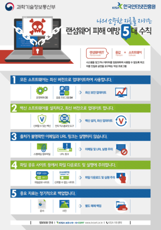 과기정통부는 랜섬웨어 피해 예방을 위해 ▲최신 버전 소프트웨어 사용 및 보안 업데이트 적용 ▲출처가 불명확한 이메일과 URL 링크 클릭 주의 ▲파일 공유 사이트 등에서 파일 다운로드 주의 ▲중요한 자료의 정기적 백업 등을 권고했다.
