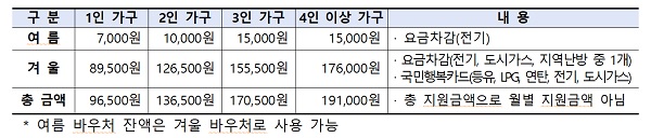 가구원 수가 많을수록 에너지 소비량이 증가하므로, 올해부터 가구원 수 구분을 3인 이상에서 3인과 4인 이상으로 조정하고, 국민기초생활보장법상 수급권자인 외국인이 세대별 주민등록표에 표기된 경우 에너지바우처 세대원에 포함해 지원할 계획이다.