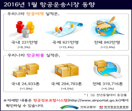 국토교통부는 1월 국제여객 및 국내여객은 전년 동월대비 각각 15.4%, 8.3% 증가했고 항공화물은 전년대비 4.3% 증가했다고 29일 밝혔다.
