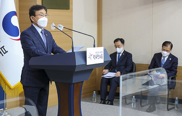 ▲ 권덕철 보건복지부 장관이 25일 오전 정부서울청사 별관 외교부 브리핑룸에서 열린 ‘한미 정상회담 결과 정부 합동 브리핑’에서 발언하고 있다. (사진=보건복지부)권 장관은 “이번 한미 글로벌 백신 파트너십 구축은 한국과 미국이 안보동맹을 뛰어넘어 백신동맹 관계로의 발전을 통해 글로벌 보건위기를 공동 대응한다는 의미가 있다”고 강조했다.