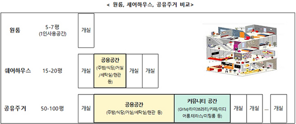 공유주거는 독립된 개인공간, 여러 명이 공유하는 공용공간(주방·욕실·거실 등), 커뮤니티 공간(카페·헬스장 등)으로 구성해 제3자(회사)가 관리하는 주거 형태다.