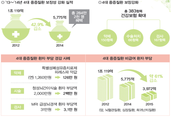 29일 보건복지부의 ‘생애주기별 맞춤형 복지 주요 성과’에 따르면 4대 중증질환자의 비급여 항목 부담은 2012년 1조 119억원에서 2015년 3972억원으로 약 61% 감소했다.