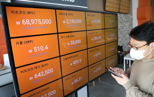 ▲ 빗썸 강남센터 전광판에 비트코인 정보가 나오고 있다.(사진=(c) 연합뉴스)회의에 참여한 관계부처들은 최근 가상자산 거래참여자 급증 등에 따라 거래투명성을 제고하고 사기·유사수신 등 불법행위로 인한 피해 예방을 강화할 필요가 있다는 데에 의견을 같이했다.