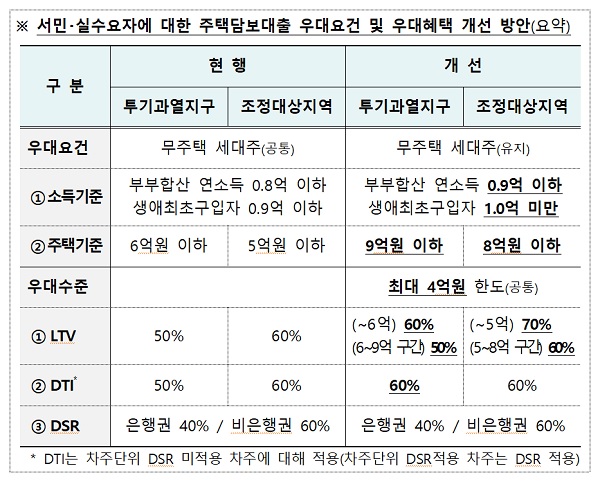 우선 무주택자 LTV 우대 혜택 요건이 완화된다. 부부합산 8000만원 이하였던 소득기준을 9000만원 이하(생애최초구입자는 9000만원 이하→1억원 미만)로 상향한다. 주택가격 기준도 투기과열지구는 6억원 이하에서 9억원 이하, 조정대상지역은 5억원 이하에서 8억원 이하로 낮춘다.