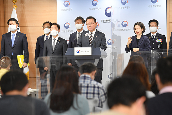 ▲ 김부겸 국무총리가 2일 정부서울청사 합동브리핑실에서 부동산 투기 조사 및 수사 중간결과를 발표하고 있다.특수본은 경찰 국가수사본부를 중심으로 금융위·국세청·금감원·부동산원 등 관계기관이 참여, 총 1560명 규모로 운영되고 있다.
