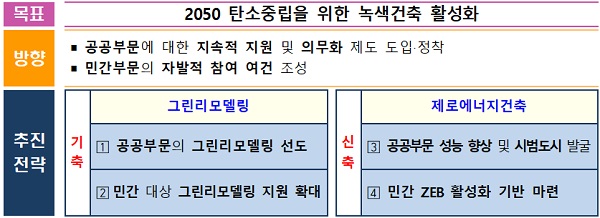 기존 건축물의 경우 그린리모델링 활성화를 위한 다각도의 지원 사업을 추진해 에너지 성능향상 및 효율개선을 추진하고, 신규 건축물의 경우 제로에너지건축물(이하 ZEB)이 보다 조기에 확산되고 2025년 민간의무화에 대비할 수 있도록 다양한 제도적·정책적 기반을 마련할 계획이다.