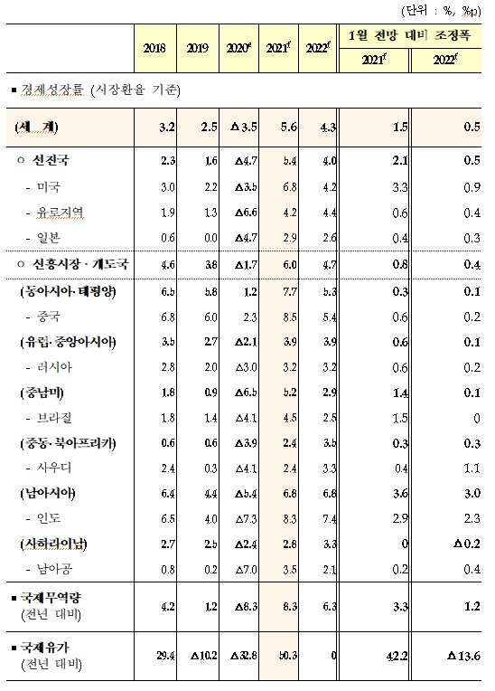 유럽·중앙아시아는 높은 외부 수요와 공산품 가격 상승 등으로 3.9%, 중남미는 백신 수급 상황 개선과 이동 제한 완화 등으로 5.2% 전망했다.