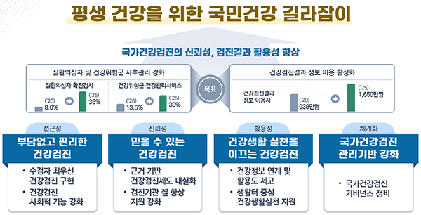 ▲ 제3차(2021∼25년) 국가건강검진종합계획 주요내용이번 종합계획은 ‘평생 건강을 위한 국민건강 길라잡이’로서의 국가건강검진의 도약을 비전으로 국가건강검진의 신뢰성과 검진결과 활용성 향상이라는 목표로 수립됐다.