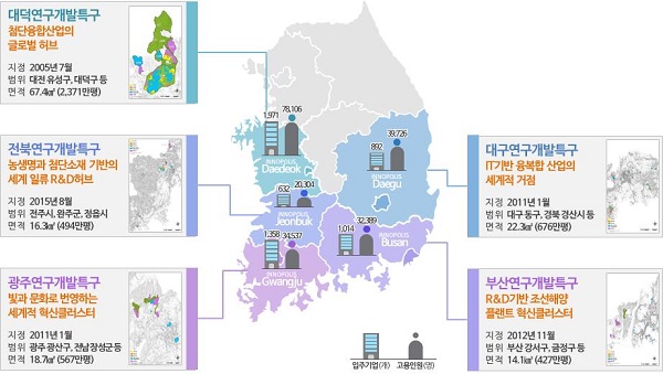 ▲ 연구개발특구(광역특구) 지정 현황.연구개발특구는 대학·연구기관·기술사업화 기업 등을 집중 배치해 연구개발을 통한 신기술의 창출 및 연구개발 성과의 확산과 사업화 촉진을 위해 조성된 지역이다.