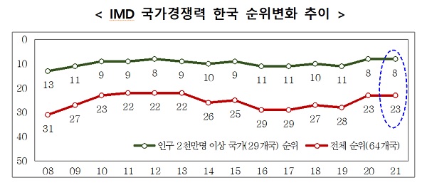 기획재정부는 IMD 산하 세계경쟁력센터(WCC)가 발간한 ‘2021년 IMD 국가경쟁력 연감’에서 한국이 경제협력개발기구(OECD) 국가와 신흥국 총 64개국 중 23위를 기록했다고 17일 밝혔다. 이는 역대 최고 순위인 22위에 근접한 수준이다.