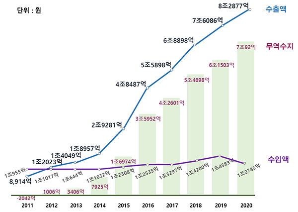 먼저 화장품 무역수지 흑자는 2012년 처음으로 1006억 원 규모로 흑자를 기록한 이래 꾸준히 증가, 2019년 6조 1503억 원(52억 7421만 달러)에 이어 지난해에는 7조 92억 원(64억 400만 달러)을 돌파하며 성장 중이다.