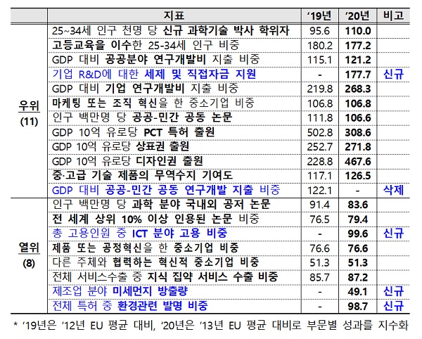 우리나라는 직접 비교가 가능한 19개 평가지표 중 11개 지표에서 EU 평균보다 우수(100점 이상)한 것으로 나타났다.