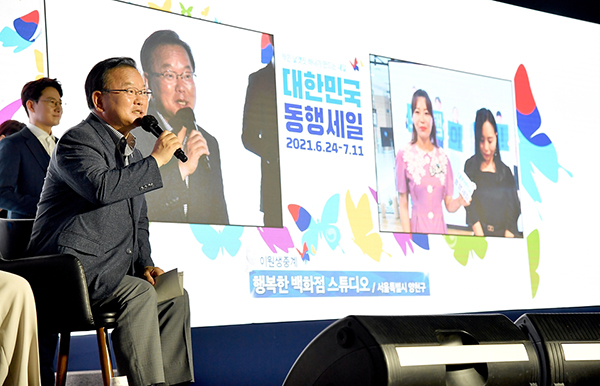 ▲ 김부겸 국무총리가 24일 종로구 세운상가에서 열린 대한민국 동행세일 개막식에 참석, 참석자들과 대화를 하고 있다.(사진=문화체육관광부)G마켓·11번가 등 온라인 쇼핑몰과 소상공인 온라인 플랫폼 ‘가치삽시다’에서는 중소기업·소상공인 우수 상품을 최대 70% 할인 판매하는 특가 기획전을 연다. 백화점·대형마트 등은 여름상품 기획 행사를 벌인다. 가전, 자동차, 가구, 의류 등 주요 소비 품목 특별 할인전 등 대규모 오프라인 행사도 개최된다.