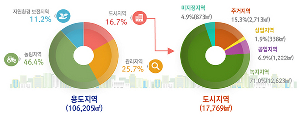 용도지역으로 지정된 국토의 면적은 10만 6205㎢로 그 중 1만 7769㎢인 도시지역이 전체 면적의 약 16.7%를 차지한 것으로 파악됐다. 주민등록상 총인구 5183만명 중 4757만명이 도시지역에 거주하는 것으로 나타났다.