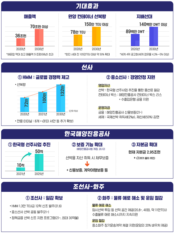 이를 통해 2030년에는 해운 매출액 70조원 이상, 원양 ‘컨’ 선복량 150만TEU 이상, 지배선대 1억 4000만DWT 이상을 달성한다는 계획이다.