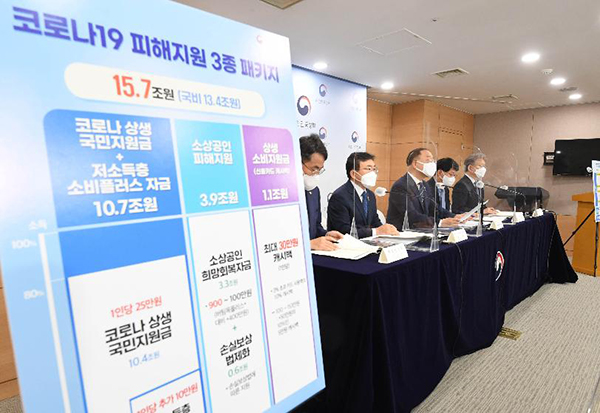 지원책을 살펴보면 먼저, 그간 누적된 코로나19 피해의 회복을 위해 15조 7000억원(국비 13조 4000억원)의 ‘코로나19 피해지원 3종 패키지’를 추진하기로 했다.