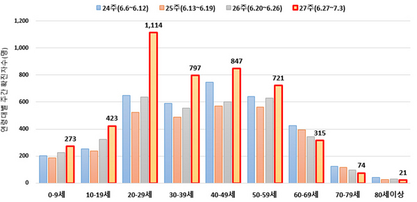 ▲ 6월 6일부터 7월 3일까지 최근 1달간 연령별 코로나19 확진자 수이 단장은 “이러한 양상은 비수도권에서도 나타나고 있고, 이용자 및 종사자들이 타 지역의 주점과 클럽을 방문해 전국적으로 확산 가능성이 높아지고 있다”고 말했다.