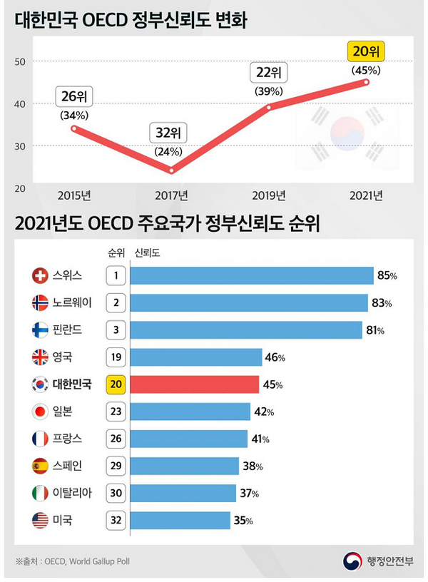 이번 조사에 따르면 한국의 정부신뢰도는 일본(42%, 23위), 프랑스(41%, 26위), 미국(35%, 32위) 등 OECD 주요국을 앞선 것으로 나타났다.
