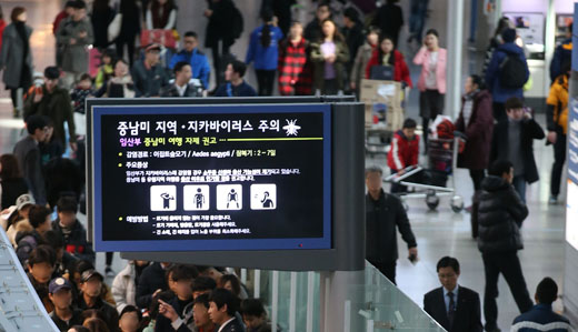 | 인천국제공항 출국장 전광판에 보이는 지카바이러스 주의 안내문.(사진=연합뉴스 제공) |