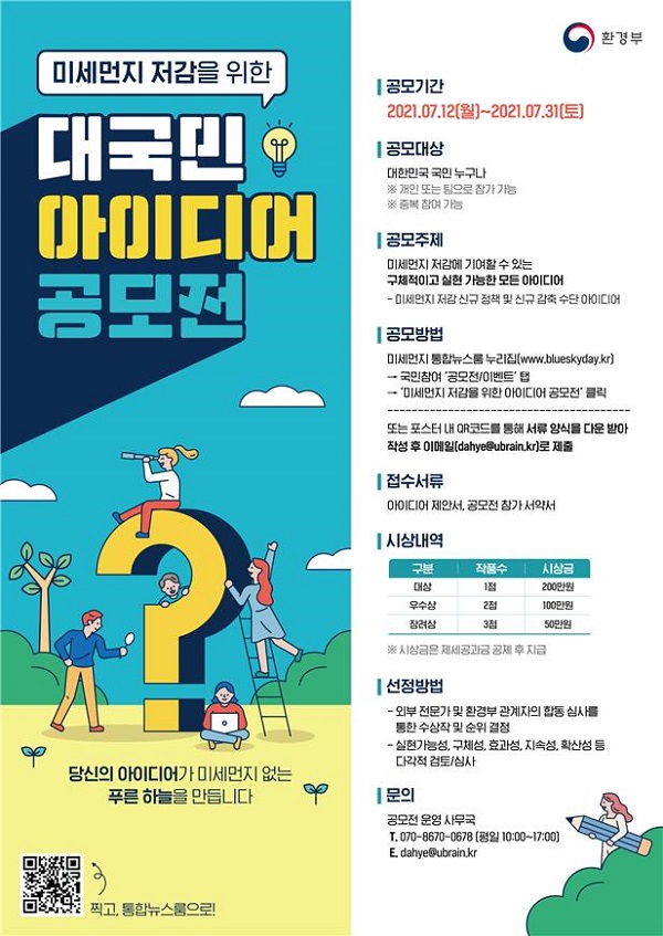 이번 공모전은 ‘미세먼지 저감 신규정책 및 감축수단 발굴‘ 등을 주제로 열리며, 미세먼지 저감에 관심이 있는 국민은 누구나 참여할 수 있다.