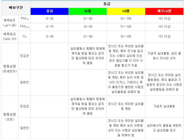 또한, 대기오염 예보내용과 시간대별 영향 모델 및 행동요령을 안내하고 있으니 참고바랍니다.
