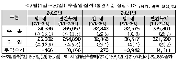 [일간환경연합 김경훈 기자]7월 들어 20일까지 수출이 지난해 같은 기간보다 30% 이상 늘었다.