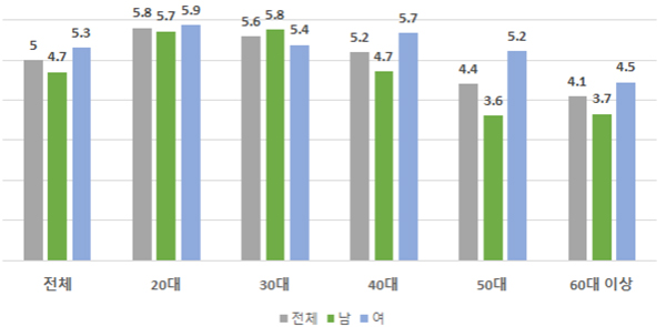 성별로는 우울 점수와 우울 위험군 모두 여성이 남성보다 높게 나타났다. 우울 점수는 20대 여성이 5.9점으로 모든 성별·연령대 중 가장 높았다. 또 우울 위험군 비율은 20대 남성이 25.5%, 30대 남성이 24.9% 순으로 모든 성별·연령대 중 가장 높았다.