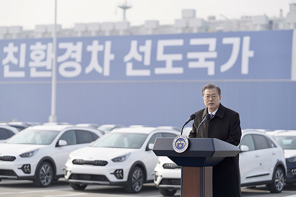 ▲ 문재인 대통령이 지난해 1월 3일 새해 첫 현장 행보로 평택항 친환경차 수출현장을 찾아 인사말을 하고 있다.(사진=청와대)해수부는 범정부적인 2050 탄소중립 실현 정책에 따라 해운·항만 등 해양수산 분야의 탄소중립 실현을 위한 다양한 정책을 추진하고 있다.