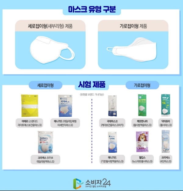 마스크는 미세먼지 등의 작은 입자를 걸러내는 정도를 의미하는 분진포집효율에 따라서 94, 80 등으로 구분한다. KF94마스크는 평균 0.4㎛크기의 미세입자를 94% 이상 차단할 수 있어야하는데, 시험 결과 전 제품이 해당 차단 성능을 갖추고 있었다.