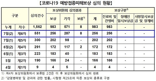 피해보상전문위는 피해보상 신청 사례 총 551건 가운데 발열, 두통, 근육통, 어지럼증, 알레르기 반응 등으로 치료를 받은 256건(46.5%)에 대해 보상하기로 했다.