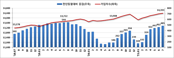 [일간환경연합 김경훈 기자]지난 7월 고용보험 가입자 수가 전년동월대비 48만 5000명 증가하면서 1439만 3000명을 기록하고 6개월 연속 증가폭이 개선돼 일자리 안전망이 강화된 것으로 나타났다.