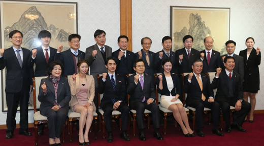 | 황교안 국무총리가 11일 오전 삼청동 총리공관에서 열린 대한민국 명장 초청 오찬 간담회에서 참석자들과 기념촬영을 하고 있다. (사진=연합뉴스 제공) |
