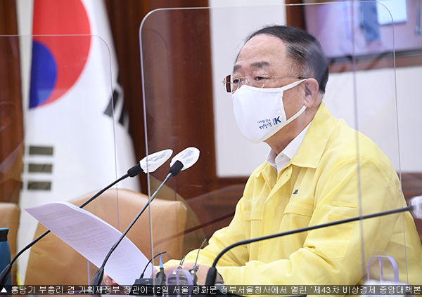 이날 제43차 비상경제 중앙대책본부 회의를 주재한 홍 부총리는 “지난 10일 코로나19 신규 확진자수가 처음으로 2000명을 넘어 방역대응이 절박한 가운데 소상공인과 자영업자들의 어려움 가중 및 버팀 한계 등도 큰 우려가 아닐 수 없고, 무엇보다 ‘신속한 지원’이 절실하다”며 이같이 말했다.