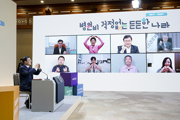 ▲ 문재인 대통령이 12일 청와대 본관에서 화상을 통해 열린 건강보험 보장성 강화대책 4주년 성과 보고대회에서 마무리 발언을 마치며 손하트를 만들어 인사하고 있다. (사진=청와대)◆ 비급여의 급여화…상급종합병원 건보 보장률 65.1%→69.5%로 상승