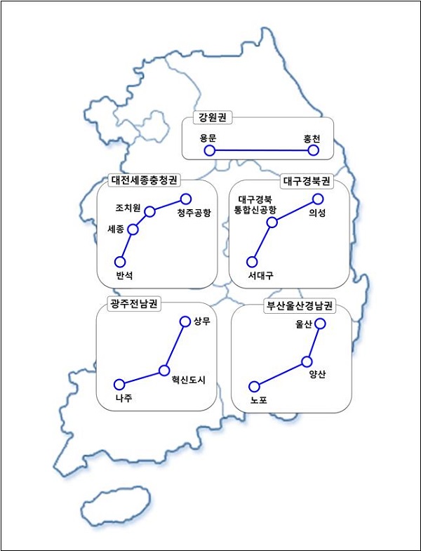 [일간환경연합 한선미 기자]부산~양산~울산, 대구~경북, 광주~나주, 대전~세종~충북, 용문~홍천 광역철도 등 권역별 1개씩 모두 5개 노선 사업이 선도사업으로 선정됐다.