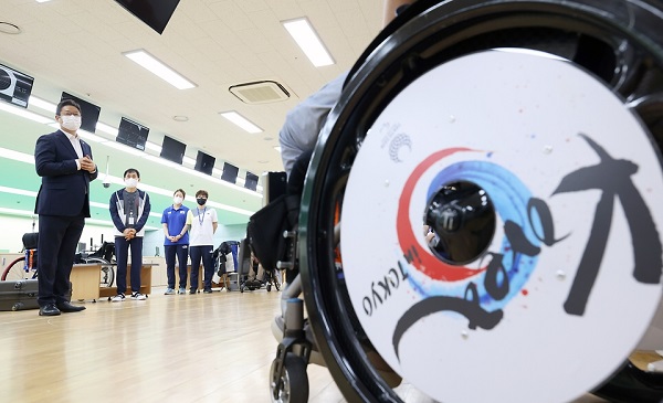 ▲ 황희 문화체육관광부 장관이 2020 도쿄패럴림픽 개막을 일주일여 앞둔 지난 17일 경기도 이천시 대한장애인체육회 이천선수촌을 방문해 사격 선수들을 격려하고 있다. 이번 캠페인에서는 서울시 영등포구 ‘더현대 서울’점 안에 장애인 안내표시(픽토그램)와 마네킹을 활용해 패럴림픽 종목과 선수들을 형상화한 공공 디자인물을 설치하고 더현대 서울점, 천호점, 신촌점의 옥외 대형 전광판을 통해 패럴림픽 선수 응원 영상을 송출한다. 또한 현대백화점그룹 통합멤버십 에이치.포인트(H.Point) 응용프로그램(앱)을 활용해 응원 행사도 펼친다.