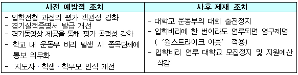 이밖에 경기동영상 제공을 통한 평가 공정성 강화, 학교 내 운동부 비리 발생 시 종목단체에 통보 의무화, 지도자와 학생·학부모 인식 개선 등을 통해 입시 비리를 예방한다.