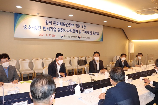 [일간환경연합 한선미 기자]문화체육관광부는 황희 장관이 27일 정부서울청사에서 중소·중견·벤처기업계 협회·단체 8곳의 관계자와 만나 문화접대비 지원 확대와 문화 분야 규제개선 방안 등을 논의했다고 밝혔다.