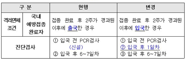 ▲ 변경 사항.하지만 중앙방역대책본부는 입국자 편의 및 행정효율 증대를 위해 격리면제 기준을 접종 완료 후 2주가 경과된 이후에 ‘출국한 경우’에서 접종 완료 후 2주가 경과된 이후에 ‘입국한 경우’로 변경한다.