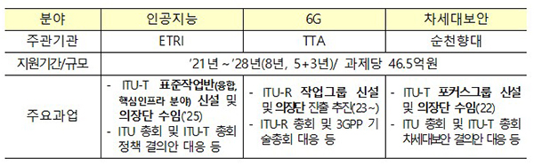 과기정통부는 올해 한국전자통신연구원(인공지능)과 한국정보통신기술협회(6G), 순천향대(차세대 보안)를 각 3개 분야에 대한 표준전문연구실 주관기관으로 선정했고, 2028년까지 과제별로 약 46억 5000만원을 지원할 계획이다.