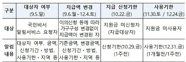 아울러 이의신청 등에 따라 가구구성 변경없이 지급액이 변경된 경우에도 ▲기존 금액 ▲변경 금액 ▲신청 기간과 방법 ▲사용기한 ▲사용 가능 지역 등도 알려준다.