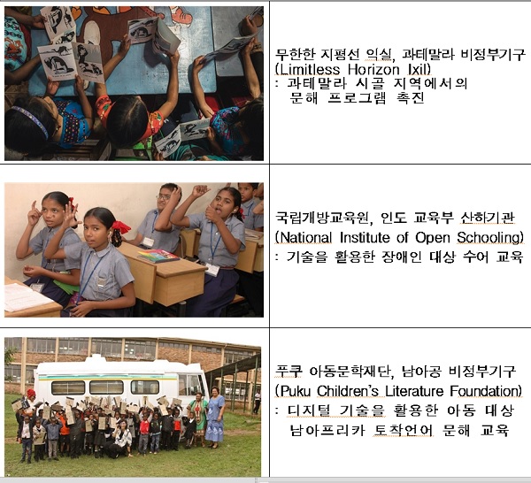 수상 단체로는 ▲과테말라의 ‘무한한 지평선 익실’(Limitless Horizons Ixil/농촌에서의 상호작용형 문해교육 프로그램) ▲인도의 ‘국립개방교육원’(National Institute of Open Schooling/수어 학습콘텐츠를 중심으로 한 기술기반 장애인 교육) ▲남아프리카공화국의 ‘푸쿠 아동문학재단’(Puku Children’s Literature Foundation/디지털 기술을 활용한 남아프리카 토착 언어 아동문학 활성화) 등 세 곳이 선정됐다.