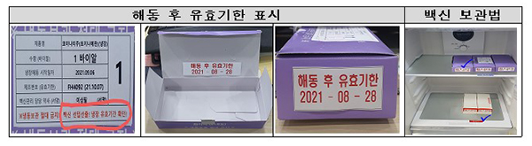 먼저 접종기관에서 손쉽게 유효기한을 확인할 수 있도록 백신 소분상자 외부뿐만 아니라 내부 및 측면에도 해동 후에 유효기한이 명시된 스티커를 부착한다.