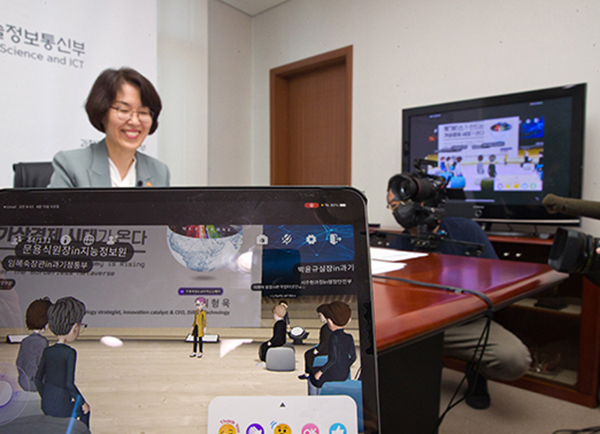 ▲ 임혜숙 과학기술정보통신부 장관이 15일 오전 서울 중구 서울중앙우체국에서 확장가상세계(메타버스) 플랫폼을 이용해 ‘제12차 디지털 뉴딜반 회의’ 를 주재하고 있다. (사진=과학기술정보통신부)지난 7월 정부는 2025년까지 총 49조원을 투자해 그동안의 뉴딜 성과를 확산하고 글로벌 시장을 선도하기 위해 초연결 신산업 육성 분야를 새롭게 추가한 ‘디지털 뉴딜 2.0’을 발표했다.