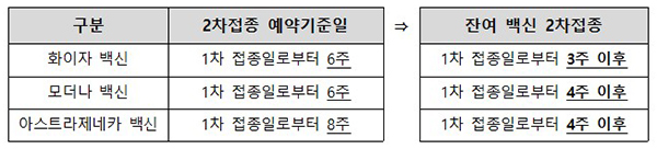 이어 “이러한 2차 접종 예약 조정 등은 백신 수급이 지속적으로 안정화되고 있는 데 따른 것”이라며 “이 경우 백신별 허가 범위에 따라, 즉 화이자는 3주, 모더나 4주, 아스트라제네카는 4~12주 범위 내에서 2차 접종이 가능하다”고 덧붙였다.