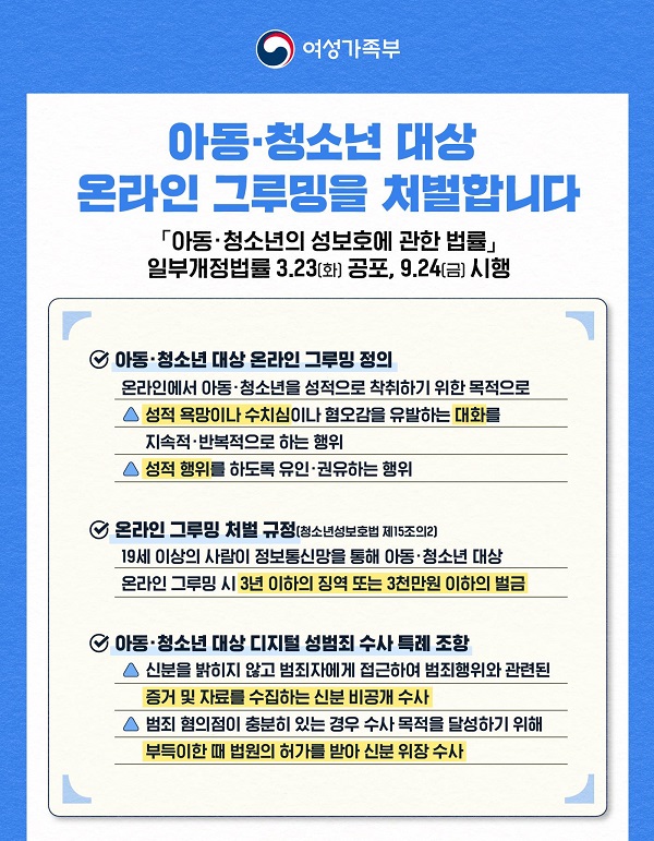 여성가족부는 23일 아동·청소년을 성적으로 착취하기 위해 유인·권유하는 온라인 그루밍 행위를 처벌하는 등의 내용을 담은 ‘아동·청소년의 성보호에 관한 법률’(이하 ‘청소년성보호법’) 일부개정법률이 24일부터 시행된다고 밝혔다.